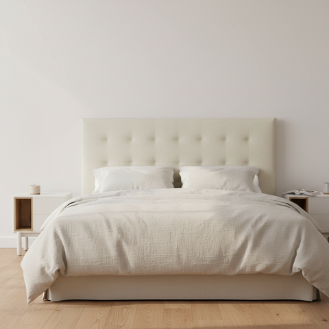 Cada cabecero se realiza a mano en nuestro taller de Valencia, cuidando cada costura, esquina y ribete. Puedes personalizarlo en una amplia selección de tejidos: lino natural, chenillas suaves, terciopelos lavables o texturas bouclé.