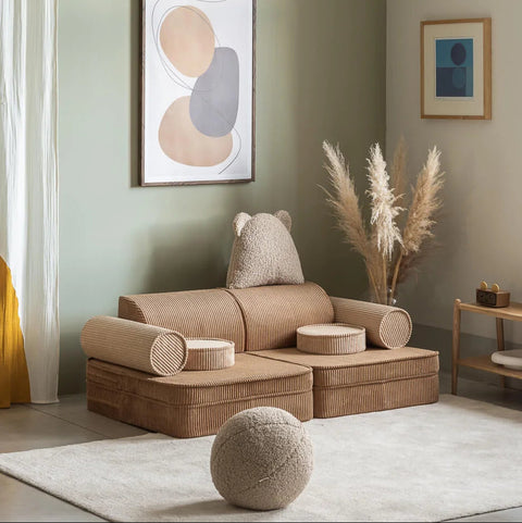 El sofá es un sistema de mobiliario modular: la mayoría de las piezas son independientes para ofrecer configuraciones flexibles. Solo el módulo principal del asiento es fijo, lo que garantiza estabilidad mientras los peques juegan