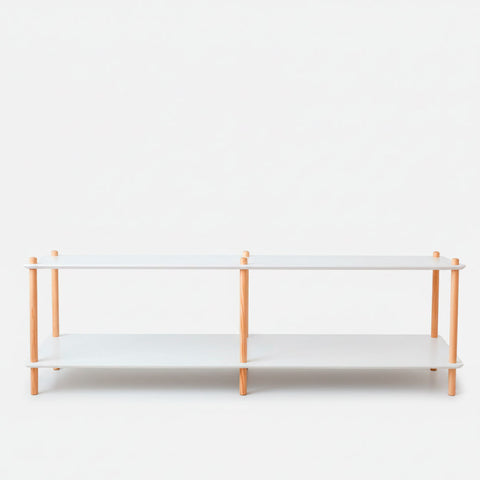 Vista frontal Módulo de Almacenaje Liure lacado blanco y puertas madera pino natural en estantería Liure comedor salón Slowdeco