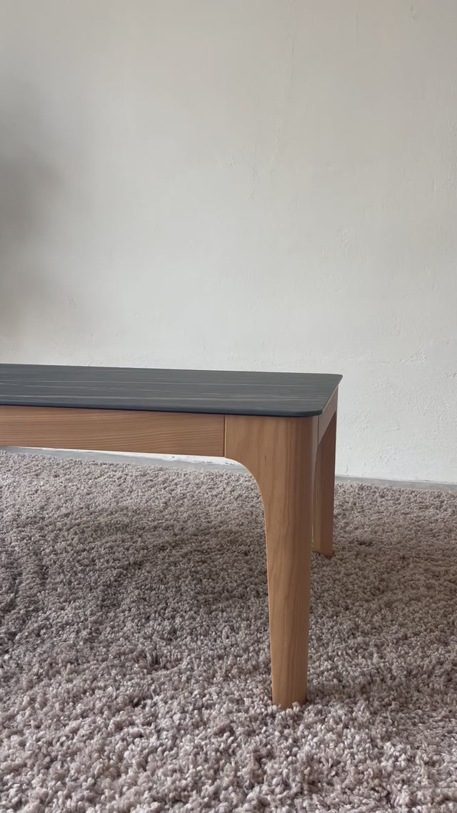 La mesa de centro Madeira combina la calidez de la madera natural con la solidez contemporánea del porcelánico. Su estructura y patas de fresno, con vetas suaves y un acabado luminoso, aportan un toque orgánico y sereno al espacio. Sobre ellas descansa una tapa de porcelánico negro, elegante y resistente, que introduce un contraste sofisticado y atemporal.
