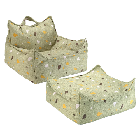 Set Puf Infantil Silla + Cuadrado de Bouclé & Chenilla Terrazo Verde