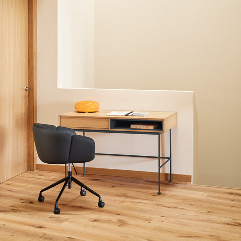 El escritorio Yoko destaca por su diseño simple y funcional, brindando una solución de almacenamiento contemporánea que se adapta a las demandas del hogar moderno. Totalmente chapado en roble, Yoko integra la calidez natural de la madera con toques de color, ideal para complementar diversos estilos de decoración.