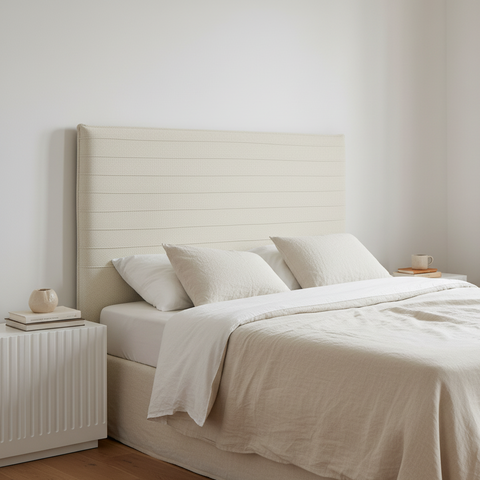 Cada cabecero se realiza a mano en nuestro taller de Valencia, cuidando cada costura, esquina y ribete. Puedes personalizarlo en una amplia selección de tejidos: lino natural, chenillas suaves, terciopelos lavables o texturas bouclé.
